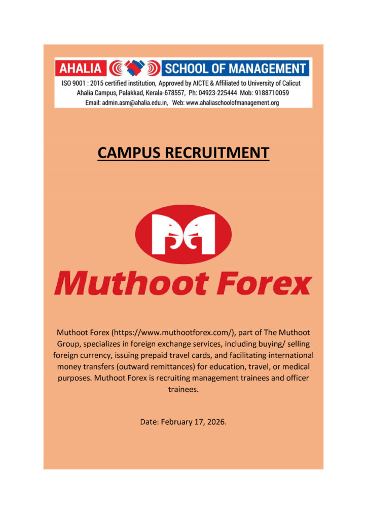 Muthoot Forex – Campus Recruitment February 17, 2026 Category: gallery, placements, Academics Comments Off on Muthoot Forex – Campus Recruitment MBA Students are invited to apply for this role.